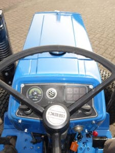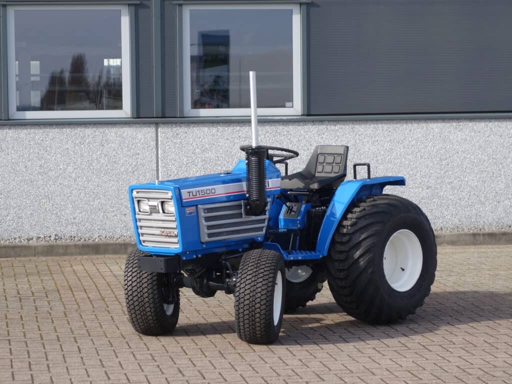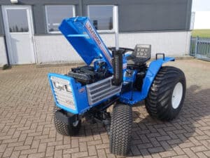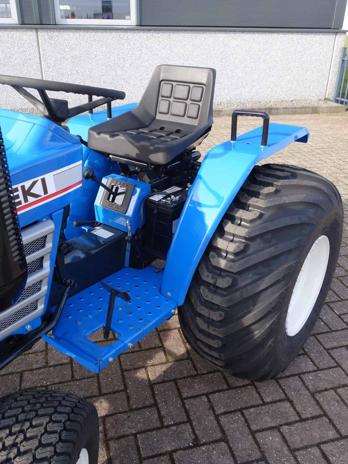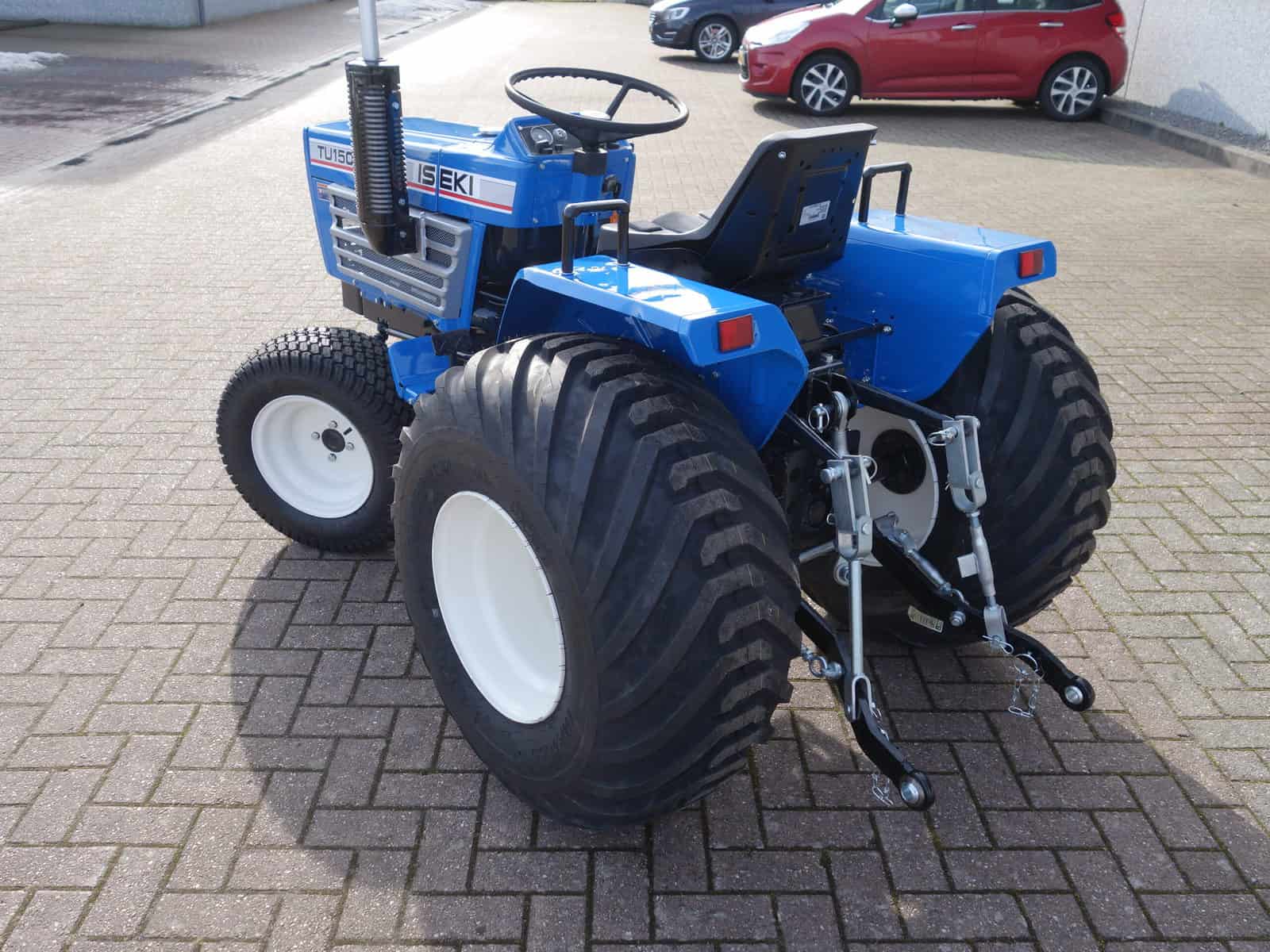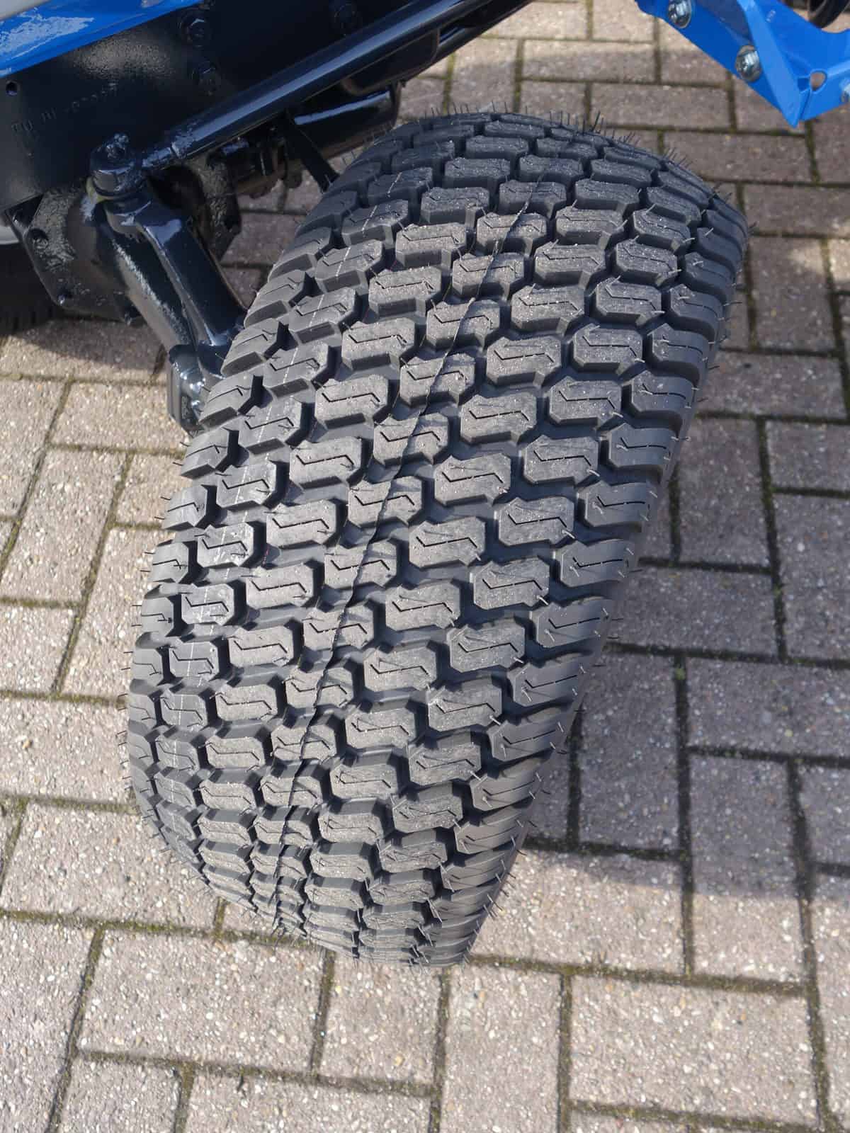 Aan de voorzijde zijn de nieuwe brede (afgeronde) grasbanden gemonteerd op de nieuwe velgen. Nauwelijks insporing, geen snijranden in de bochten en toch (waar nodig) inzetbaar als 4wd band. Tevens hebben we deze brede band ook met een (laag) V-profiel. Dit geeft geen meerprijs. Deze prachtige set banden zijn gemonteerd op een 18 Pk sterke Iseki TU1500 4wd. 3 cilinder dieselmotor, hef en aftakas aan de achterzijde, geheel klaargemaakt en klaar voor gebruik. Supernette en goede trekker, geleverd met garantie.
