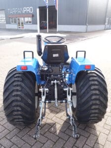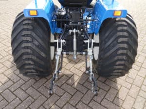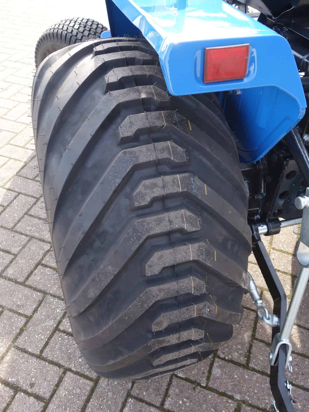 Aan de achterzijde voorzien van nagenoeg nieuwe velgen en nagenoeg nieuwe tractiebanden, mooie afgeronde nok waardoor een afgeronde band ontstaat, hierdoor snijdt de band minimaal in de ondergrond zodat je nauwelijks ziet waar je hebt gereden. Door de open nokken behoudt deze band toch de goede tractie. Door de breedte van de band wordt de druk goed verdeeld en is er nauwelijks insporing. Een ideale combinatieband dus, weinig insporing en toch goede tractie!