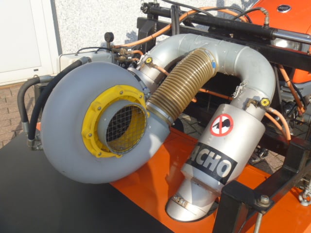 De lucht afkomstig van de ventilator wordt doorheen de brander gestuwd en na opwarming stroomt deze warme lucht verder uit in de schroeikamer waar het onkruid vernietigd wordt.